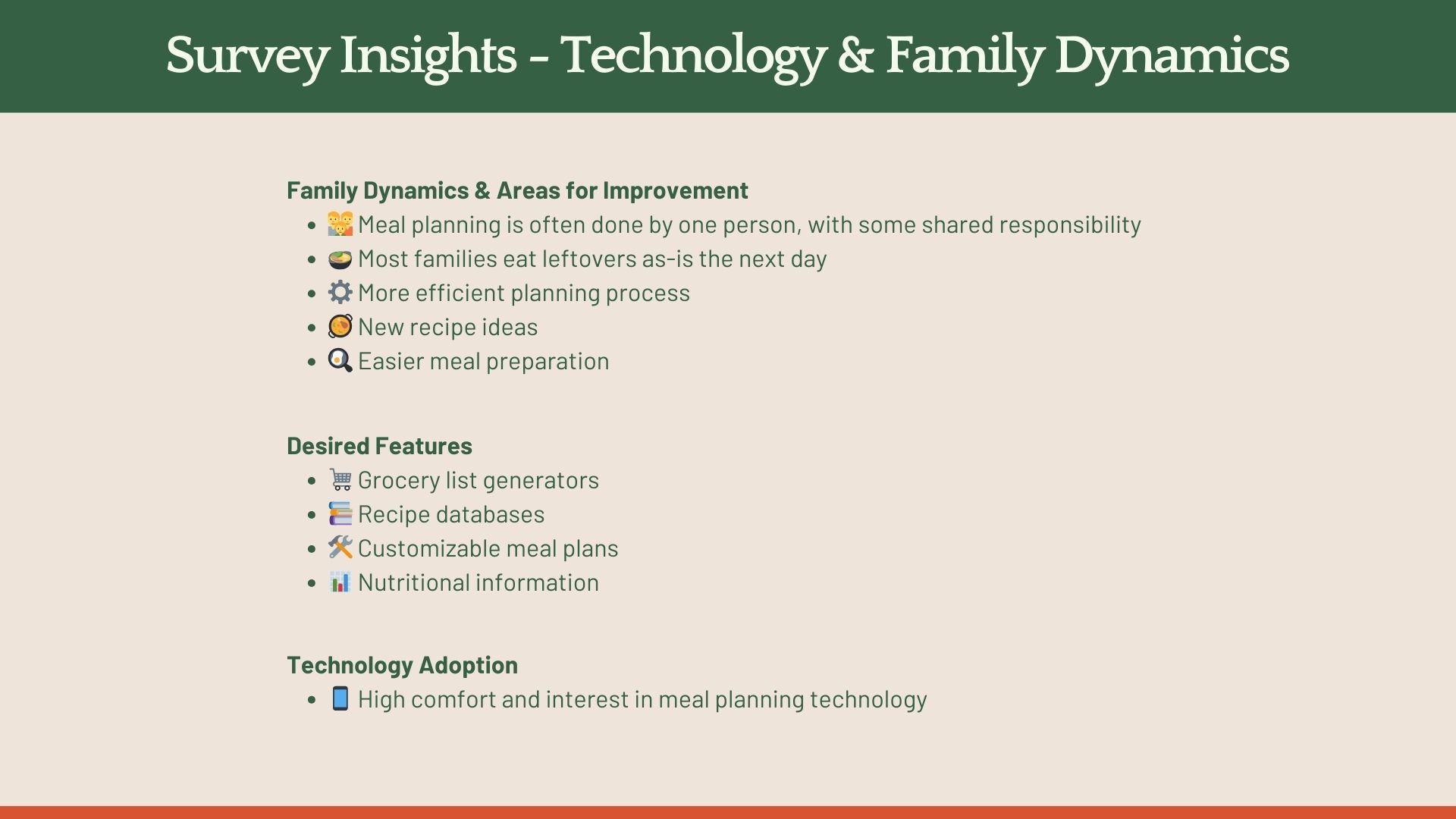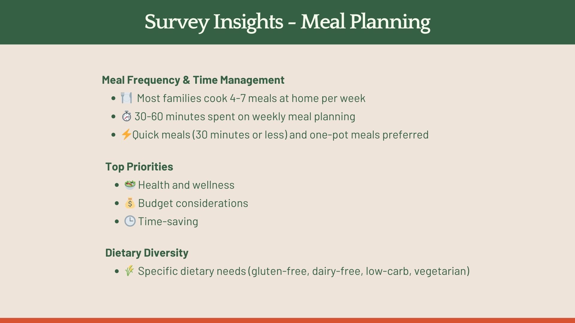 Key Research Finding: 15 busy families surveyed revealed that existing meal planning solutions don't fit real family workflows. Most parents spend 2+ hours weekly on meal planning with inadequate tools that fail to accommodate dietary restrictions, family preferences, and time constraints.